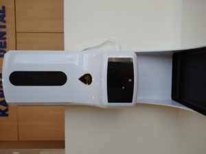 さて、今回は新しく購入した消毒液のディスペンサーを紹介したいと思います。いままではアルコールのジェルを患者様が押して使用する物でしたが、このような時期なので手をかざすと自動で噴射されるタイプに変更しました。それと同時に検温までしてくれる優れものです(*^^*)